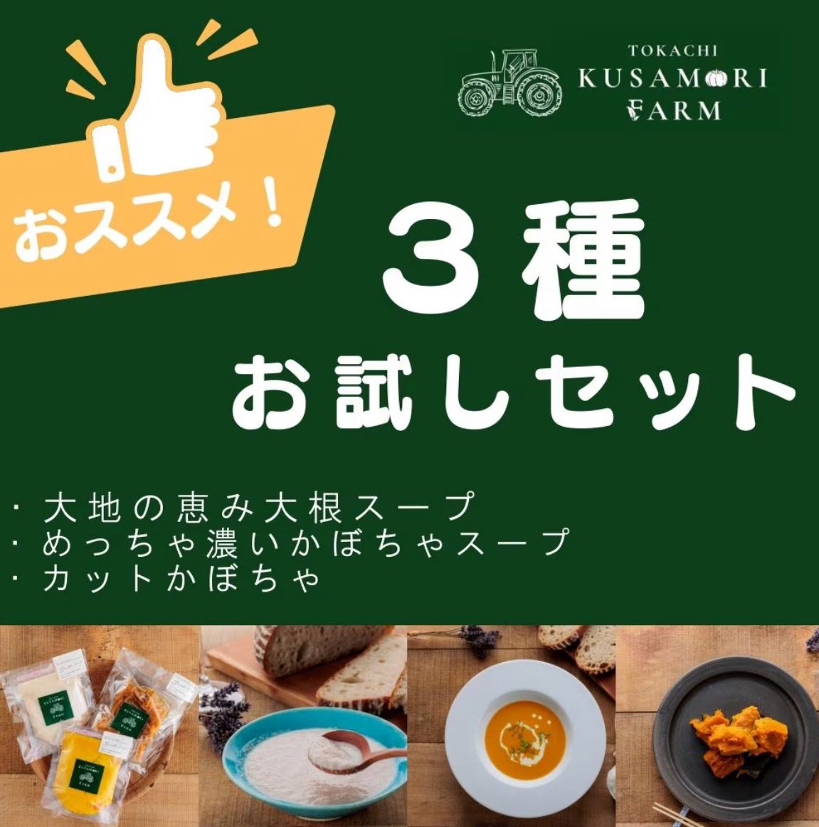 人と環境にやさしい食を目指す草森ファームより、大地の恵み大根スープ・めっちゃ濃いかぼちゃスープ・カットかぼちゃをセットにして3名様にプレゼント!
