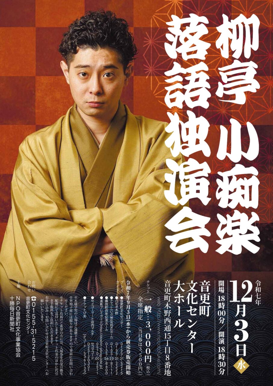 若手を代表する人気落語家「柳亭小痴楽(りゅうてい こちらく)」さんが音更に!1988年東京生まれ、16歳で落語会に入門。2019年に真打に昇進し、若手を代表する人気落語家として活躍されています。 そんな柳亭小痴楽さんの独演会が12月3日(水)音更町文化センターで行われます。中々聞くことができない、生の粋な江戸前落語をお楽しみください。チケットは前売り3,000円、当日3,500円で好評発売中です。(独演会の詳細は下記URLよりチェック!)